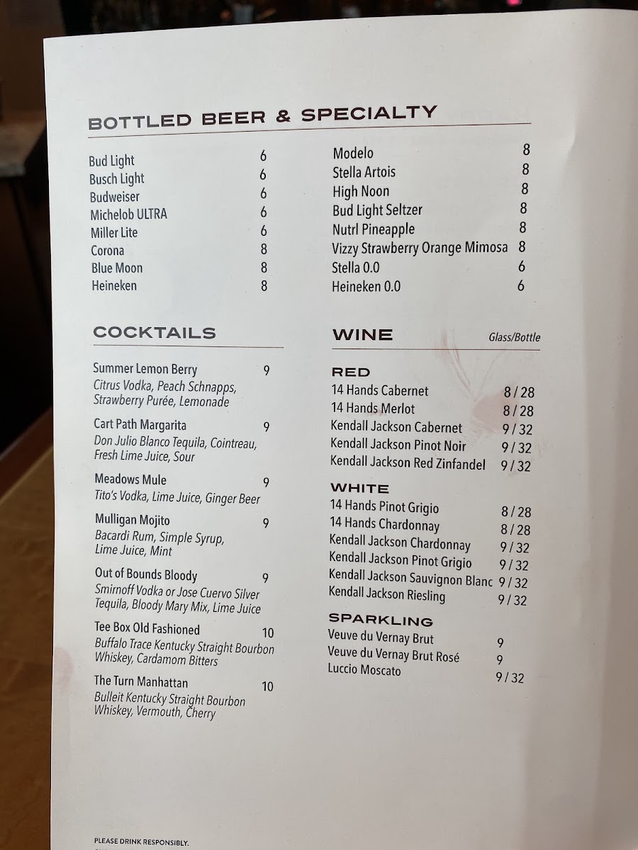 Start your meal with tempting appetizers like Sea Salt and Lime Tortilla Chips or HouseMade Truffle Potato Chips. The bar boasts an impressive lineup of cocktails, including refreshing options like the Summer Lemon Berry and classic favorites like the Tee Box Old Fashioned, each priced at just $9-$10.